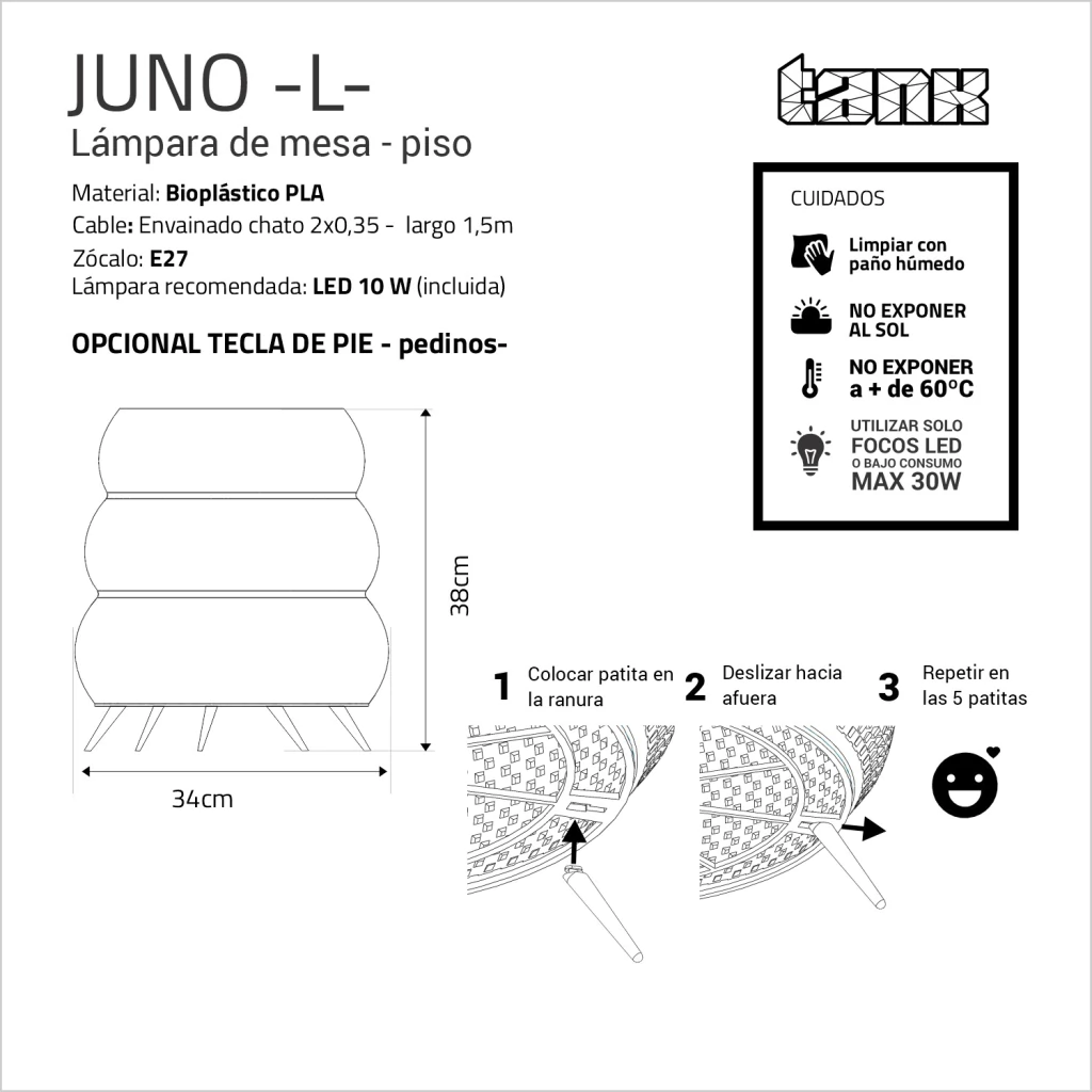 Ilumina tus espacios con estilo y sostenibilidad con la lámpara Juno. Su diseño único, inspirado en formas orgánicas y modernas, destaca por su trama detallada y llamativa, creada mediante tecnología de impresión 3D. Juno aporta calidez a cualquier ambiente y también cuida del planeta.