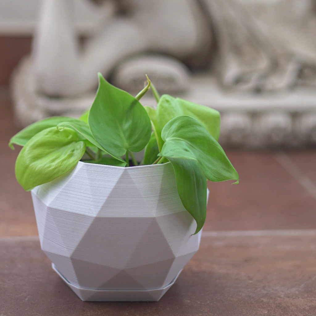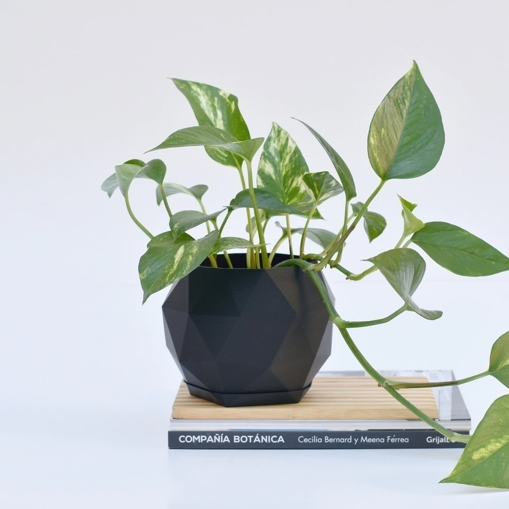 Maceta de diseño geométrico, fabricada con bioplástico de origen vegetal (PLA).