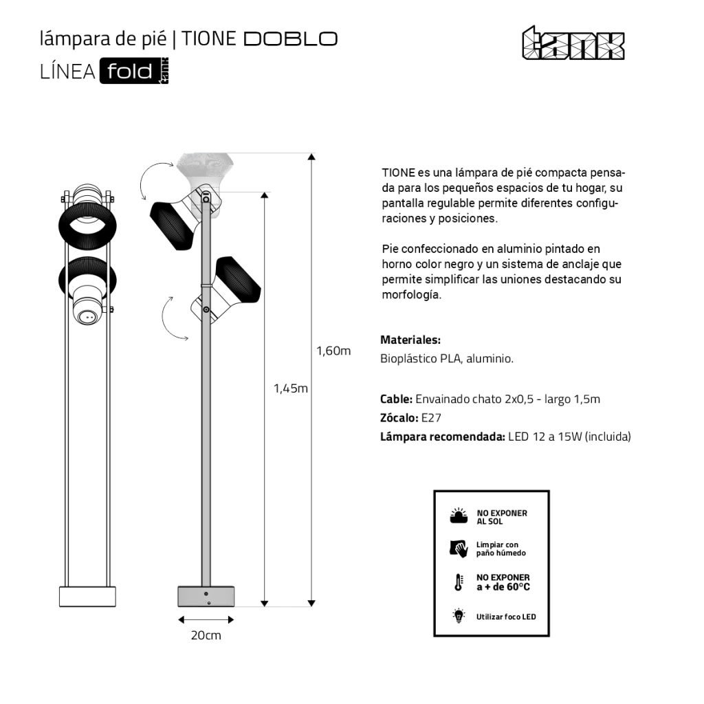 TIONE es una lámpara de pié compacta pensada para los pequeños espacios de tu hogar, su pantalla regulable permite diferentes configuraciones y posiciones.
