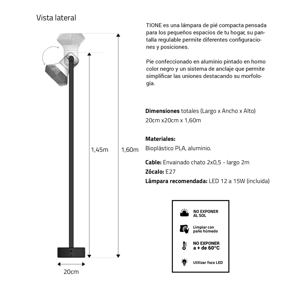 TIONE es una lámpara de pié compacta pensada para los pequeños espacios de tu hogar, su pantalla regulable permite diferentes configuraciones y posiciones.